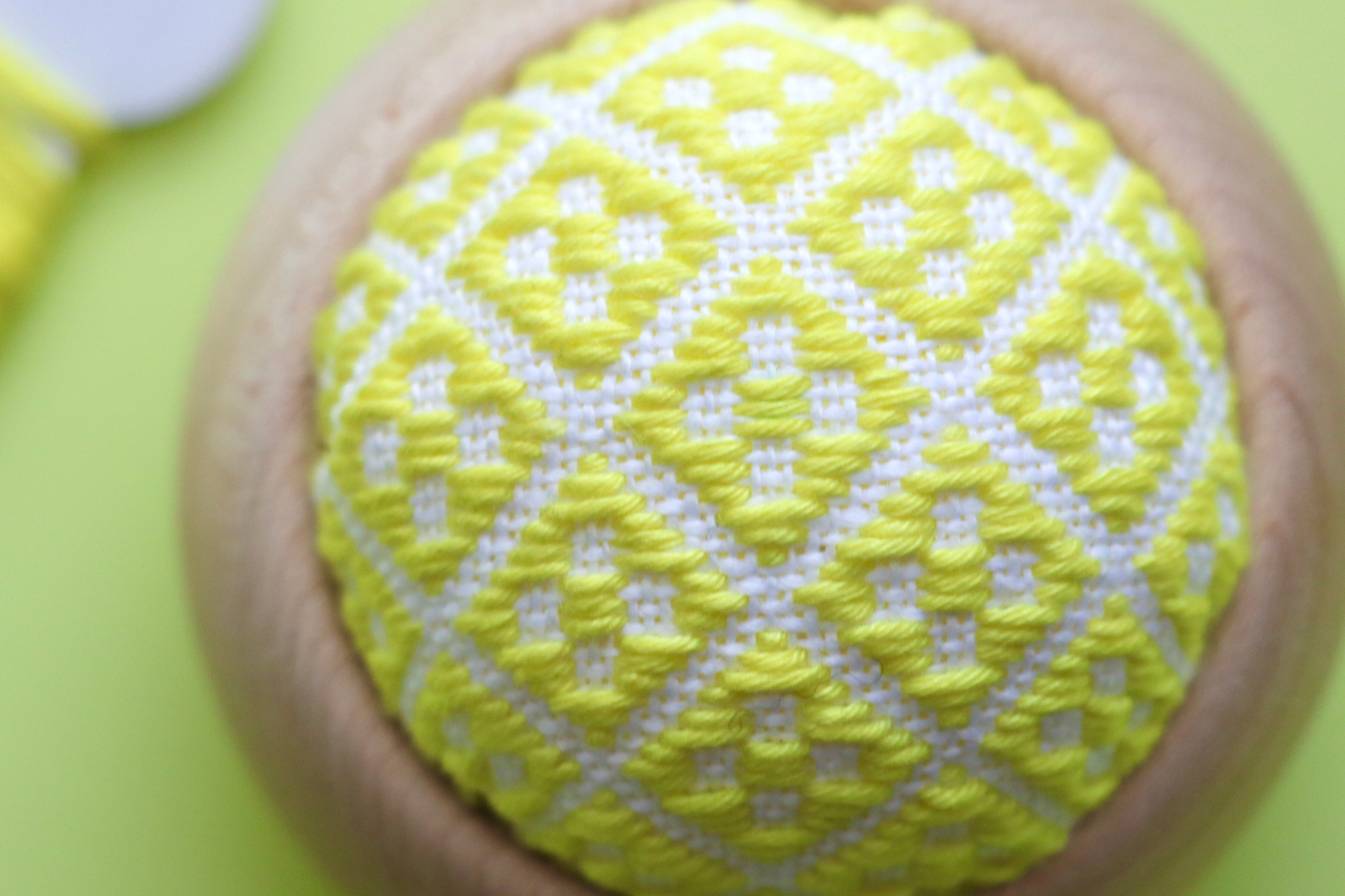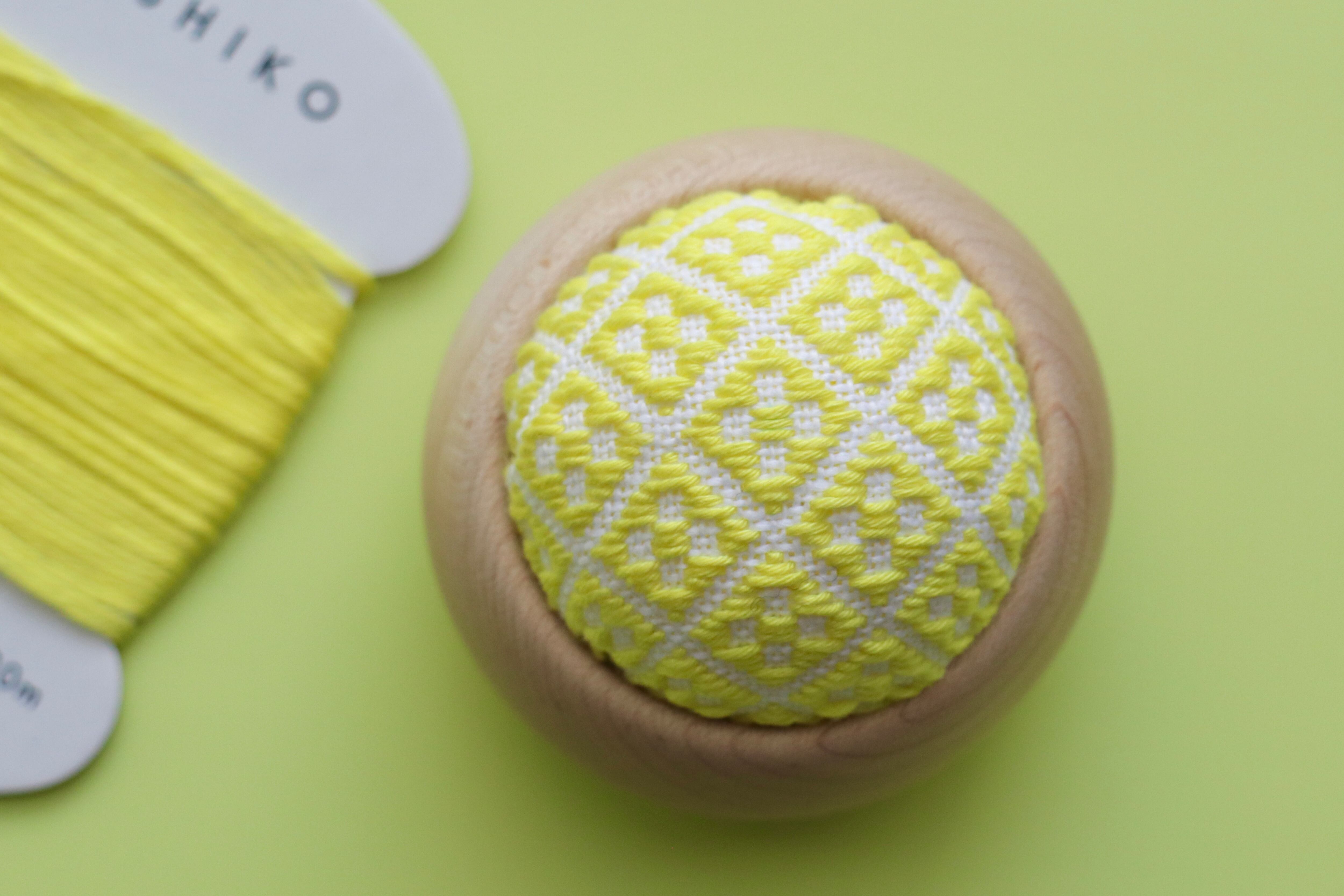 針山の土台は、九州の木工工房さんで一つ一つ手作りで製作された上質なウッドボウルを使用しています。手に持った時の木の感触や肌触りがとても良く、こぎん刺しとの相性も抜群です。
